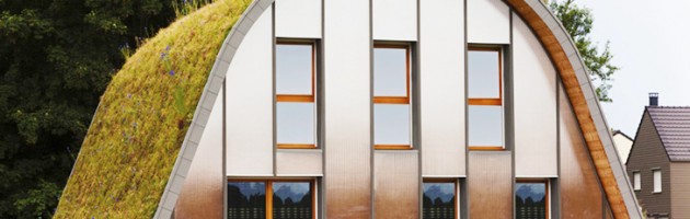 La casa de dos pisos llamada “La Maison-vague”, fue diseñada por el arquitecto Patrick Nadeau, bajo la propuesta de una cubierta semicilíndrica con vegetación que envuelve la casa y que forma parte de las 63 casas experimentales que se están construyendo cerca de Reims en Francia, c